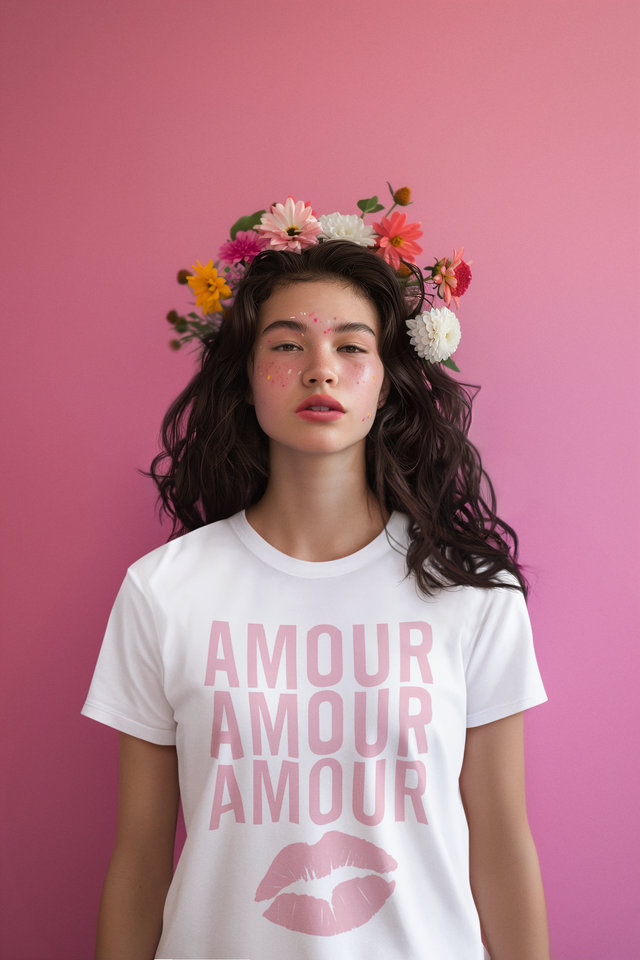 Soft, simple, and full of heart — this tee speaks in blush tones. The stacked “AMOUR” print and a single kiss motif sit centered on a clean white canvas, giving the shirt a quietly romantic, vintage-inspired look. Lightweight but durable cotton holds the print crisp and flat, while the classic crew cut and relaxed fit let this shirt live in everyday moments: coffee runs, slow walks, late-night playlists, and small celebrations with someone who understands you. It feels like something worn when you want to say a little love without saying a word.